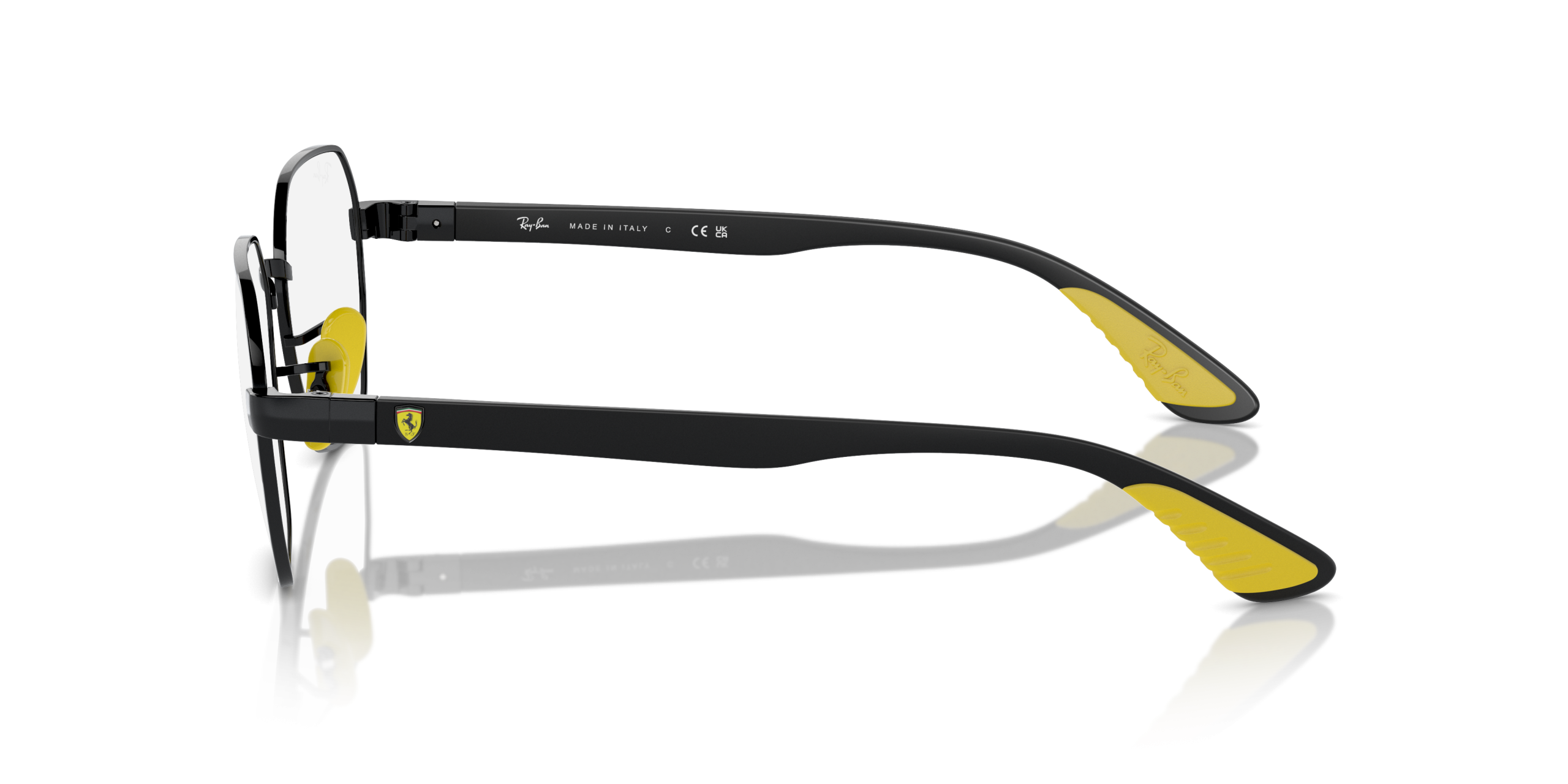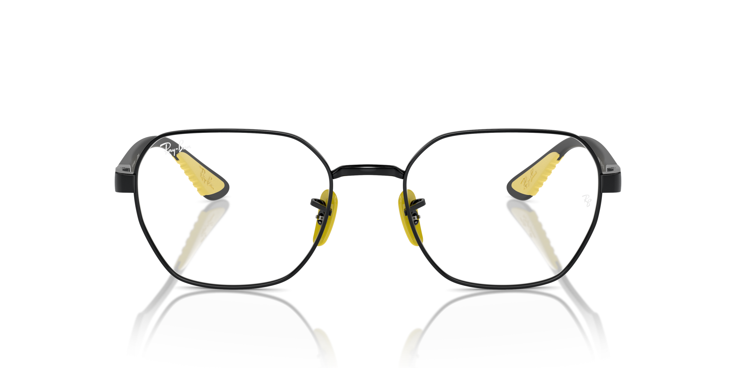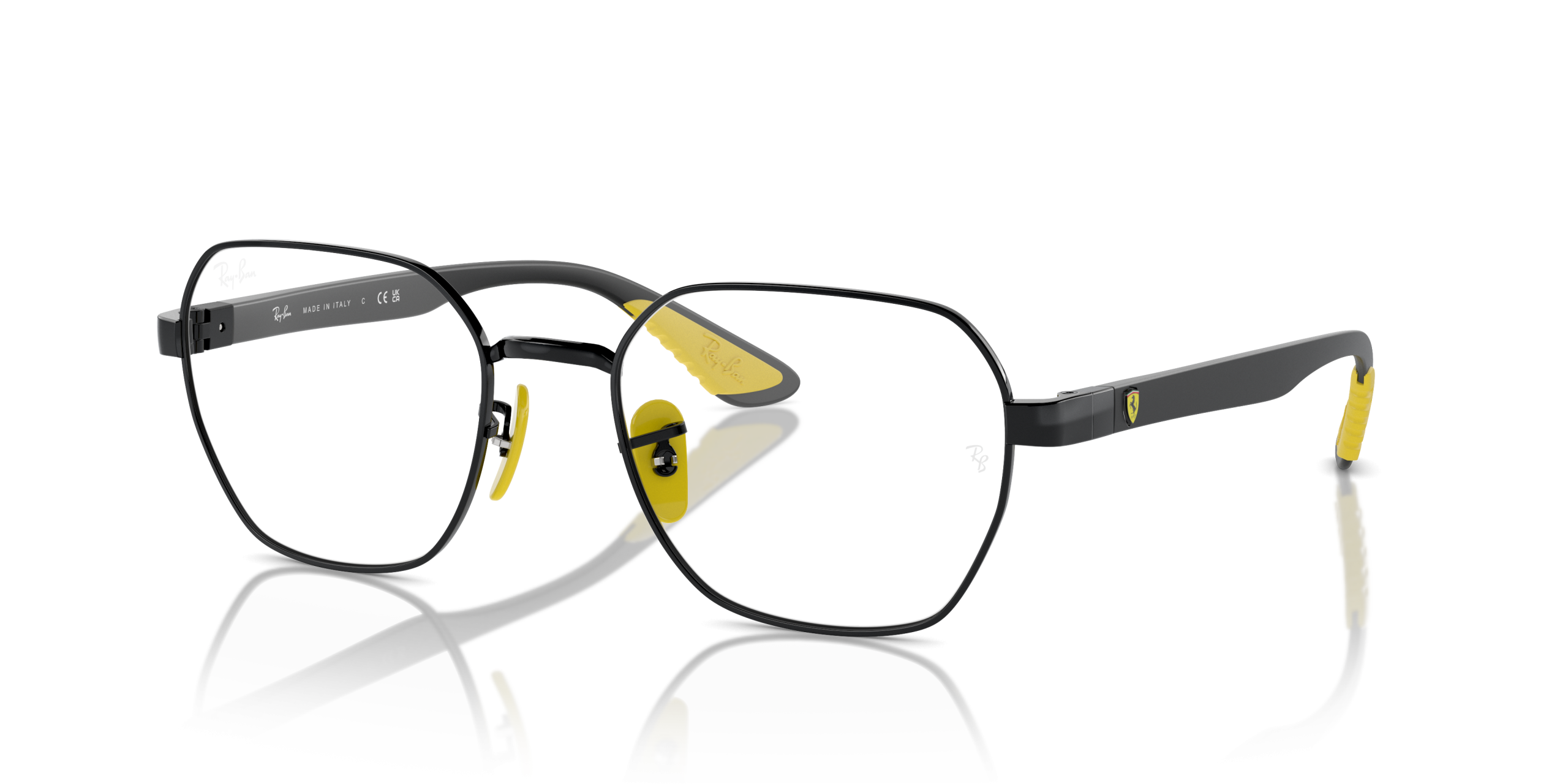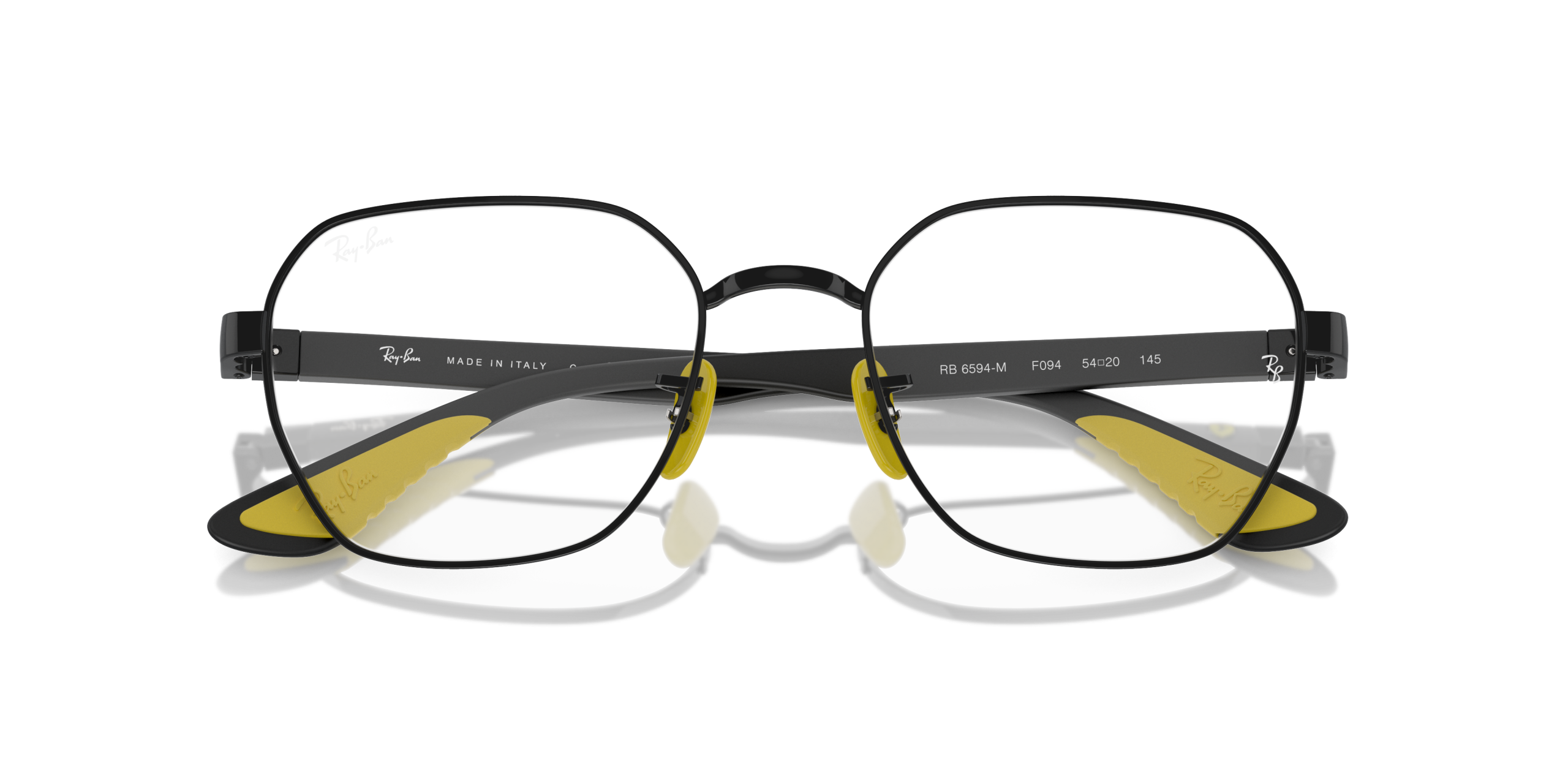 Ray-Ban RB6594M Optics Scuderia Ferrari Collection with their irregular shape, and black frame, feature the iconic racing team red metal accents on the temples, paying homage to the heritage of both Ray-Ban and Ferrari. These shades are perfect for those who want to make a statement with their eyewear while still maintaining a sleek and sophisticated look.