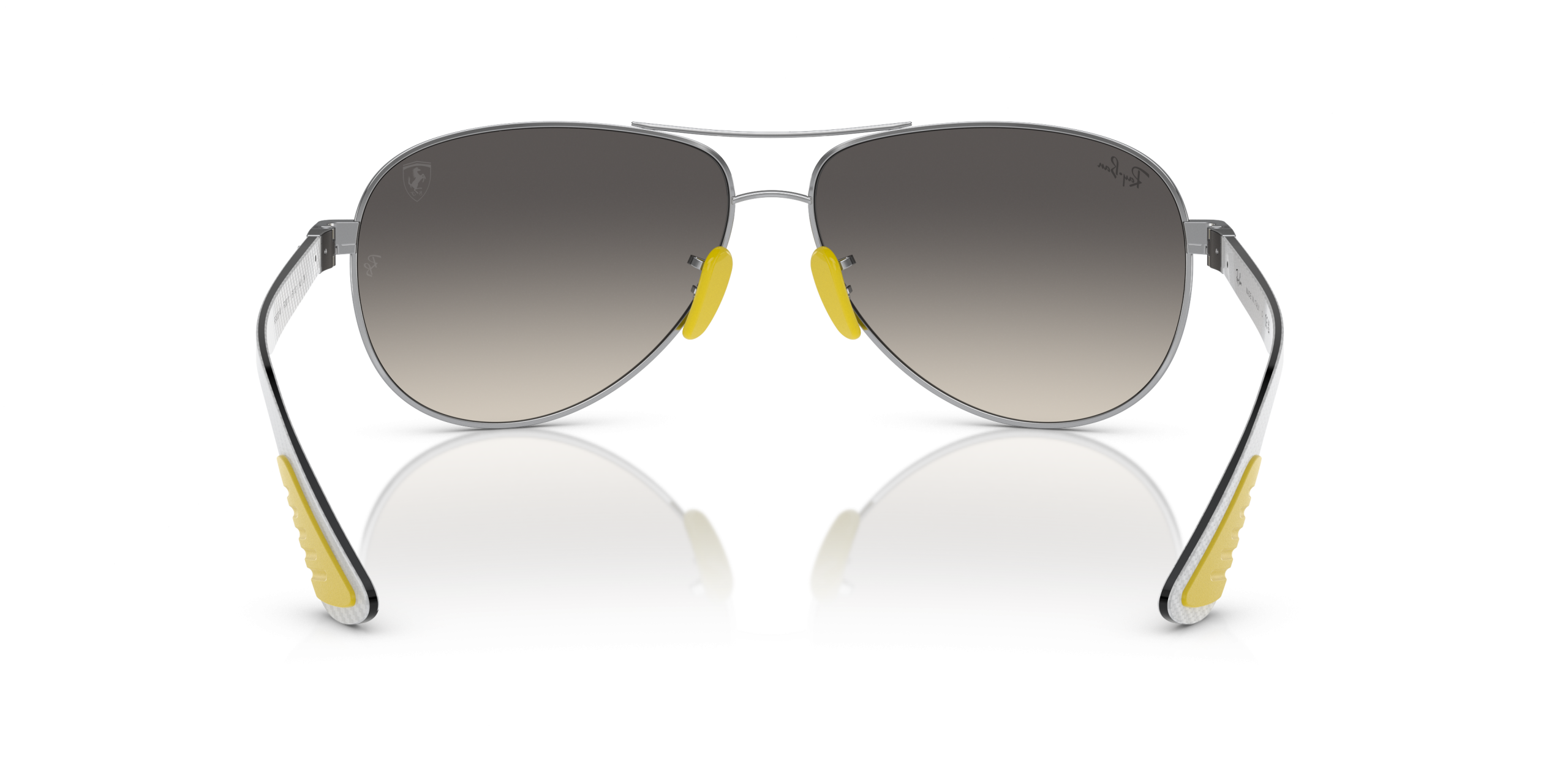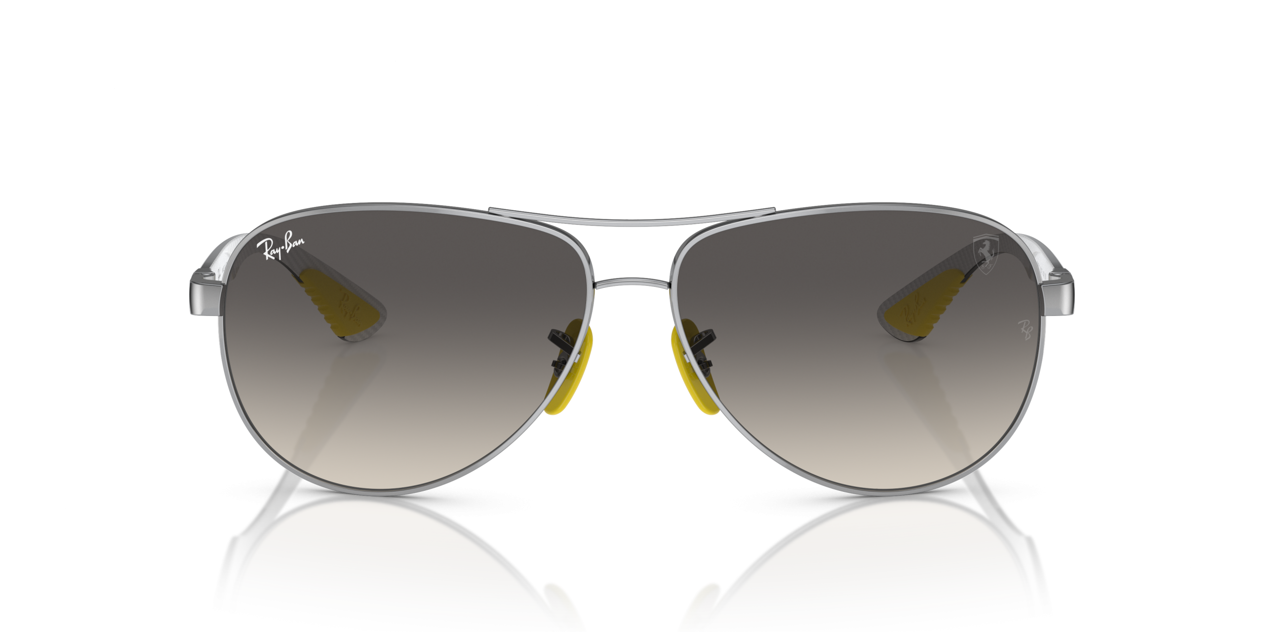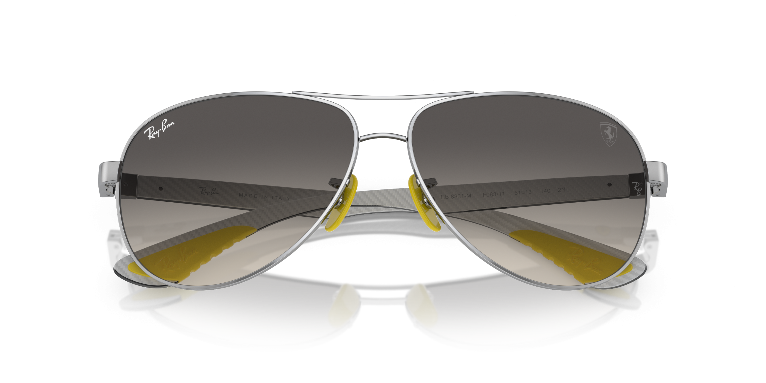 RB8331M Scuderia Ferrari Collection from Ray-Ban celebrates the iconic racing team with a bold and glamorous look. The frame is metal, with silver frame and gradient grey lenses. Always racing forward, always with style.