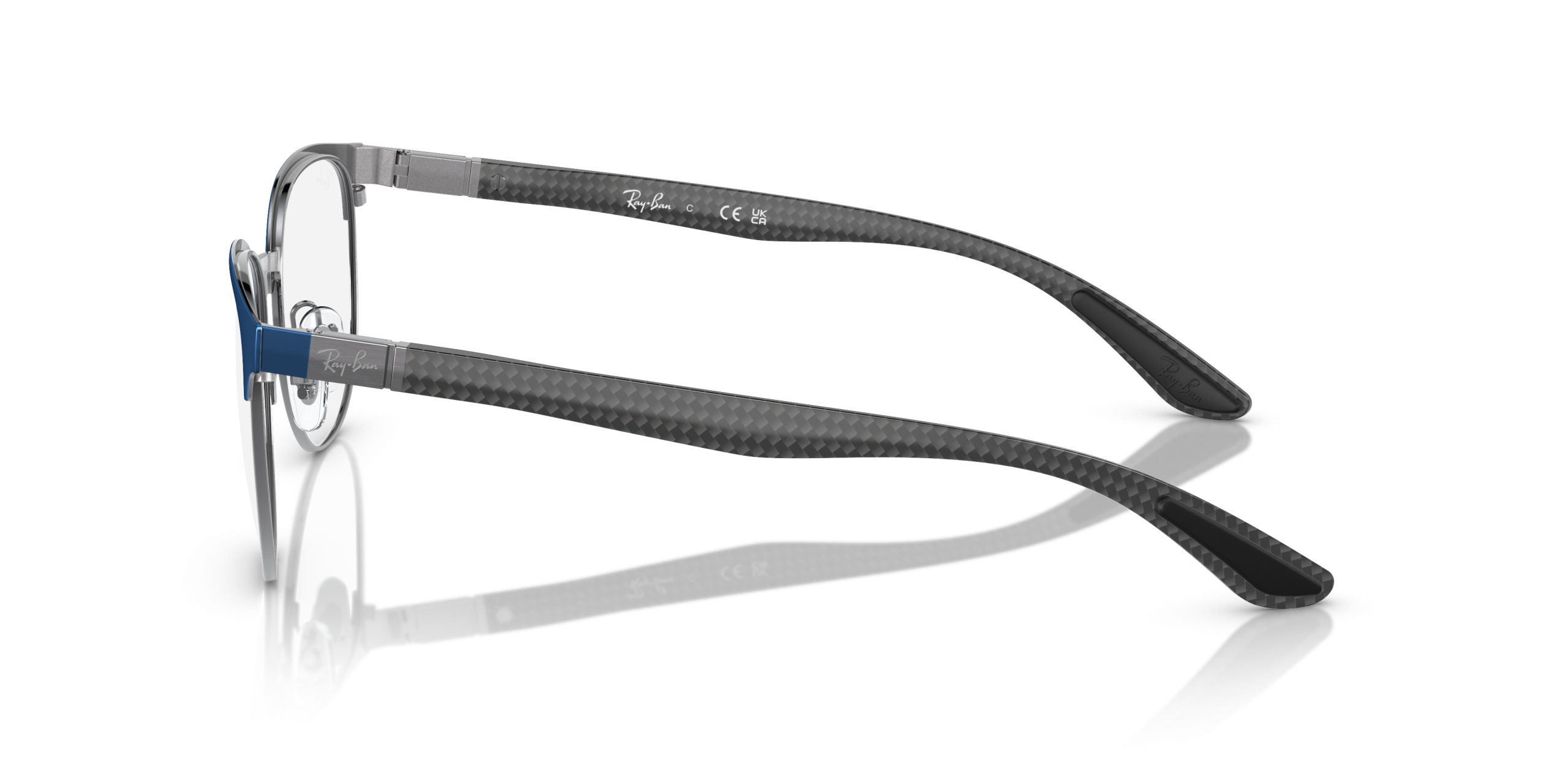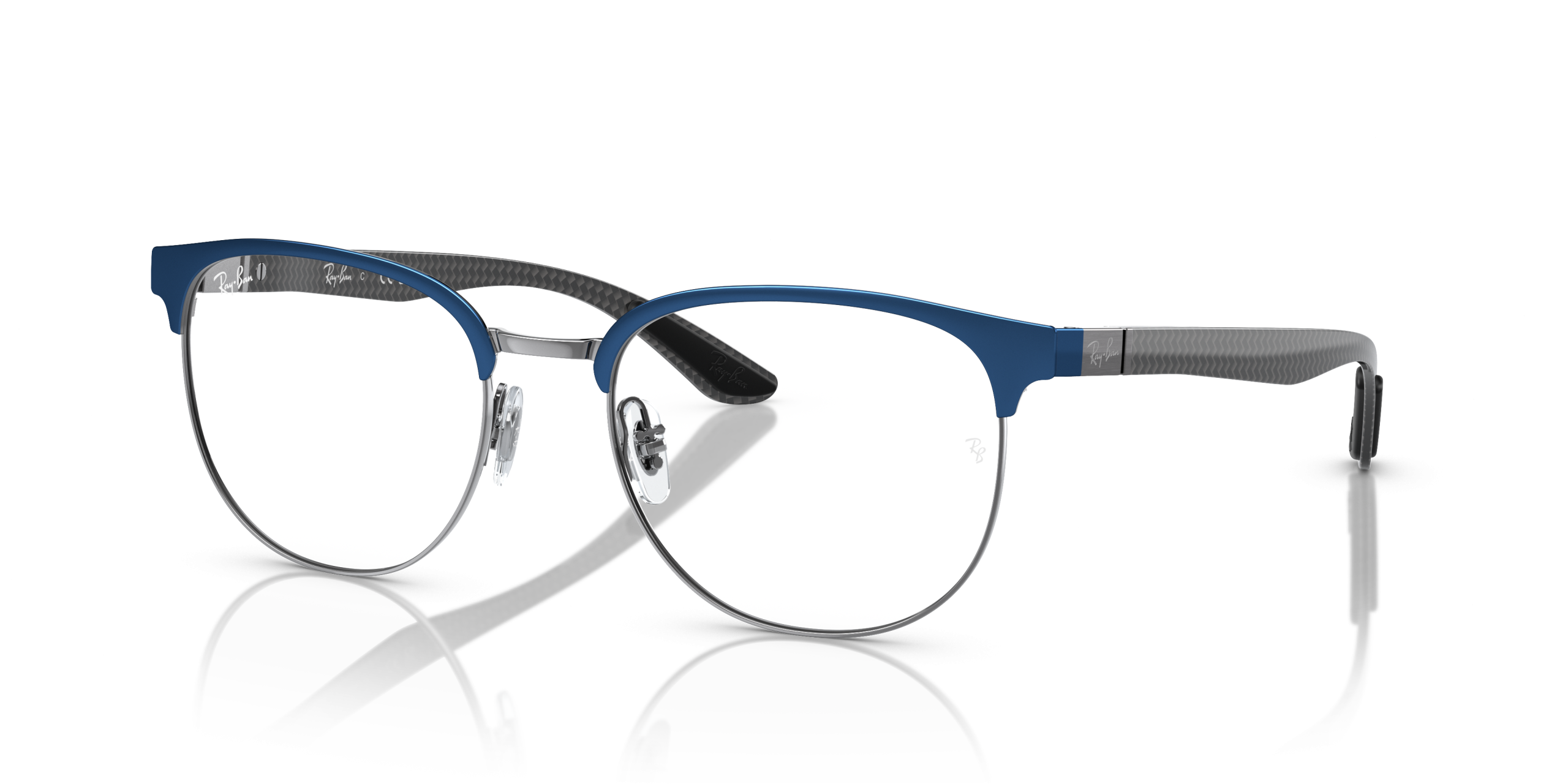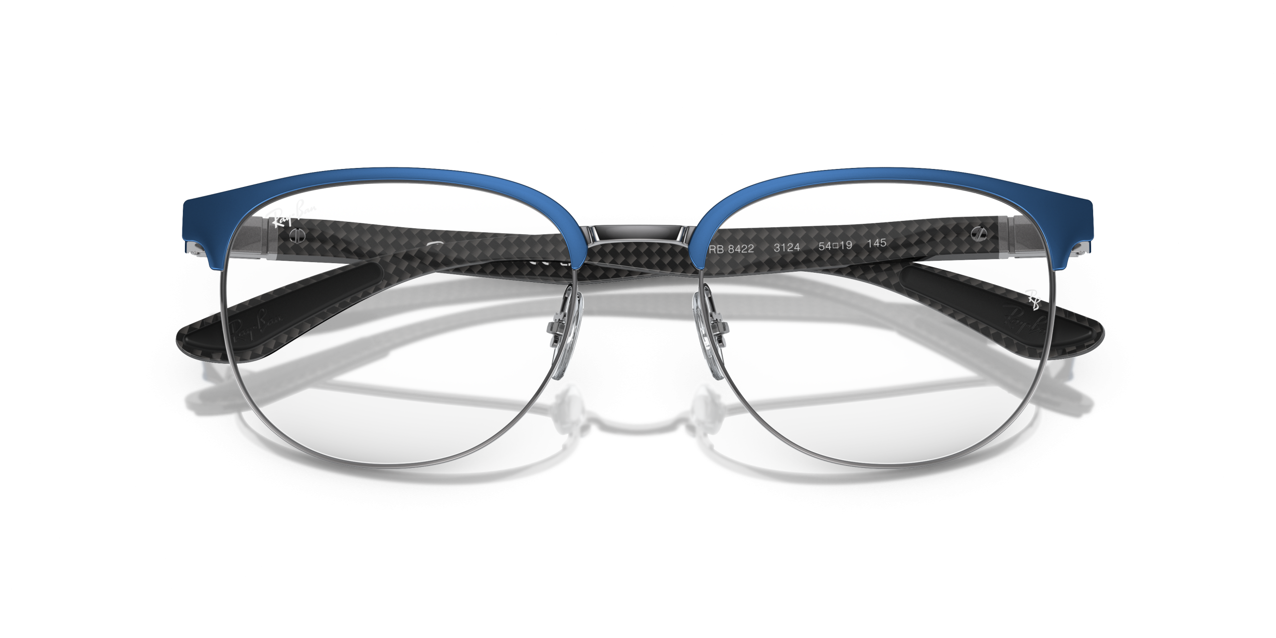 Ray-Ban RB8422 Optics eyeglasses are a new interpretation of the popular Ray\u2010Ban Classics Optics frame. These metal frames, designed for unisex, feature a versatile irregular shape and soft blue on gunmetal metal temples.